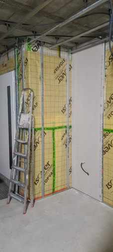 En comparaison des tours de fenêtres, les autres plaques sont faciles et rapides à poser ! Il faut juste ne pas oublier de découper les trous ronds, à la scie-cloche, pour récupérer les gaines et les fils électriques des futurs interrupteurs et prises de courant.
