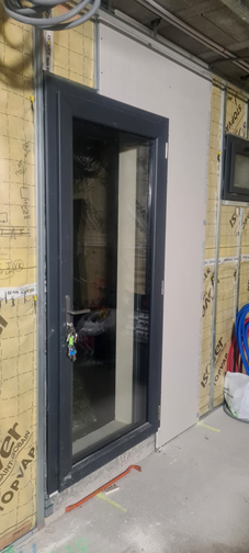 Et ce n'est pas tout, loin de là, puisque nous avons eu une autre excellente surprise : les « menuiseries » (autrement dit les portes et les fenêtres) sont elles aussi en place (y compris les portes de garage, et la baie vitrée du salon salle à manger) ! Que de travail abattu en une semaine !