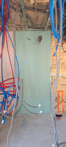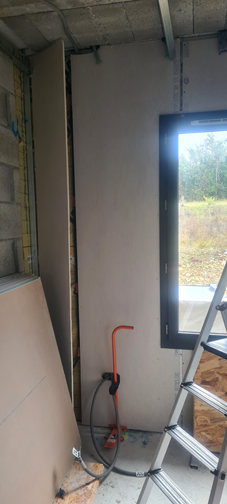 Une fois que ces gaines bleues et rouges ont été finies de tirer, nous sommes passés au collage de plaques de placo, le long du mur de refend ouest, de la chambre jusqu'aux WC.